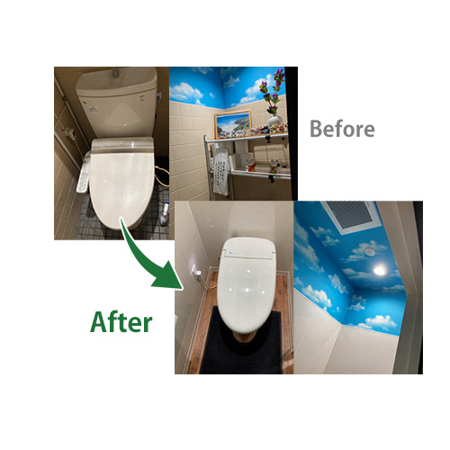 居酒屋のトイレのリフォームを行いました。元々天井の壁紙が青空だったため、そちらを活かし、大変明るく、清潔感のある施工を行いました。ご利用の皆様からも「すごく綺麗!」というお声が多いようで、確実に効果を実感いただております。