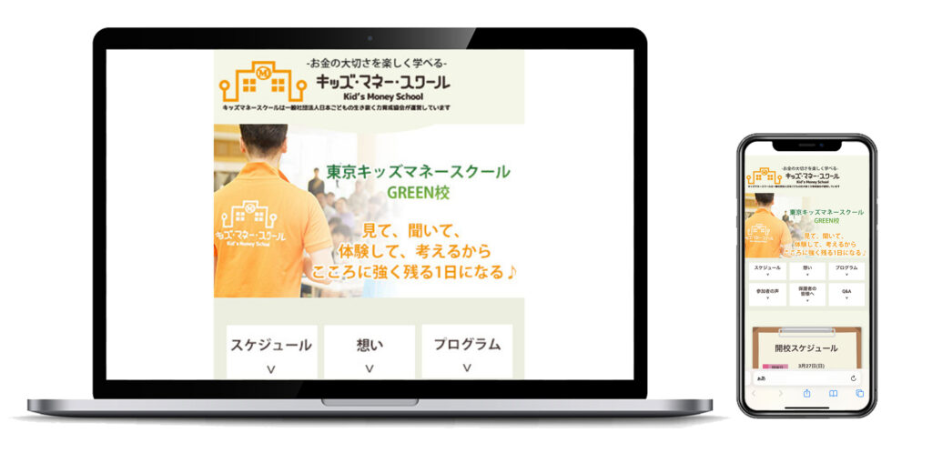 東京キッズマネースクールGREEN校のLP制作を行いました。スマートフォンファーストのサイトとなっており、スマートフォンとパソコン両方が同じ表示になるように設計されています。どのような目的でサイトを制作するのか。に合わせて適切な設計を行い、WEBを有効活用できる最適なサイトをご提供いたします。